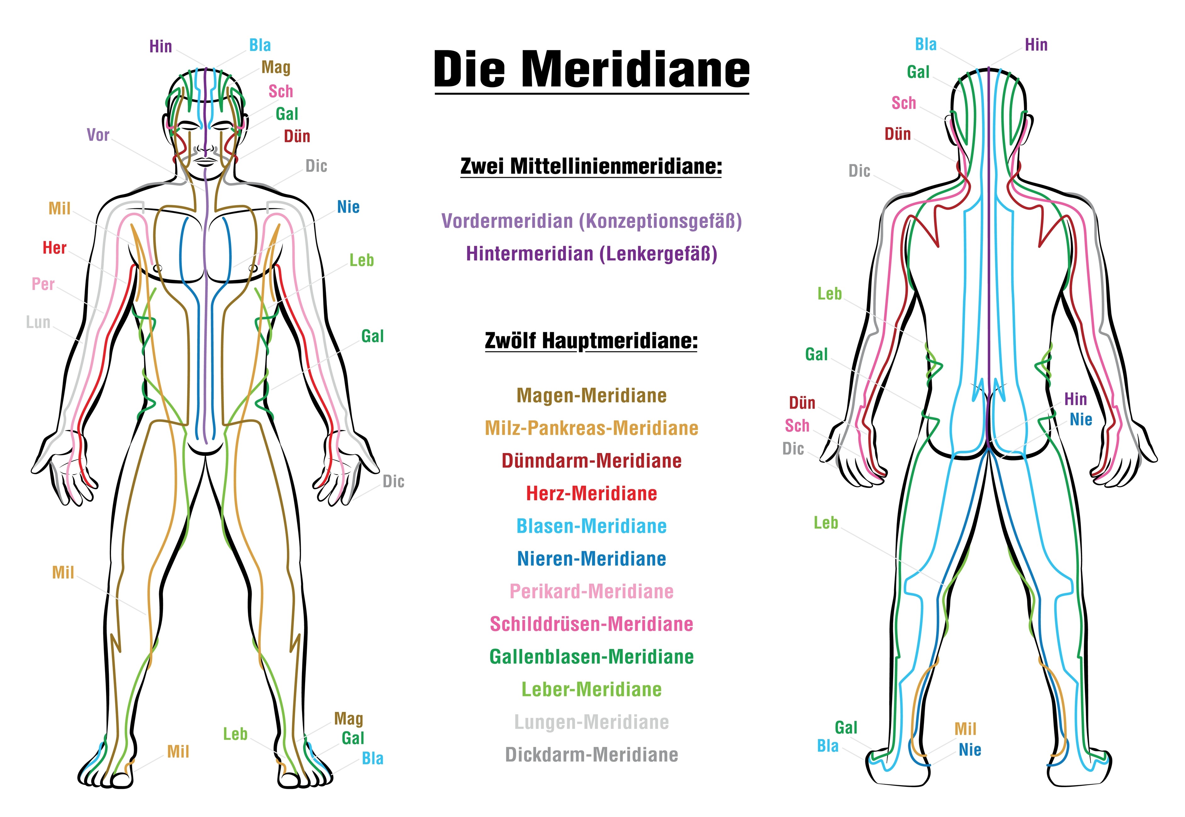 Die Lebensenergie fliest durch die Meridiane und versorgt unseren gesamten Organismus (Organe und Gewebe) mit Energie, vergleichbar mit den Blutbahnen, Nervenbahnen oder dem Lymphsystem. Auf den Meridianen liegen auch die Akupunktur Punkte, das sind jene Punkte, an welchen die Energiebahnen (Meridiane) besonders gut erreicht werden können.